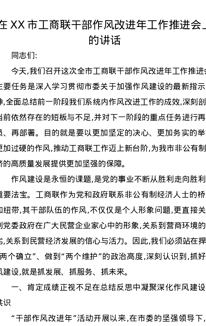 在XX市工商联干部作风改进年工作推进会上的讲话