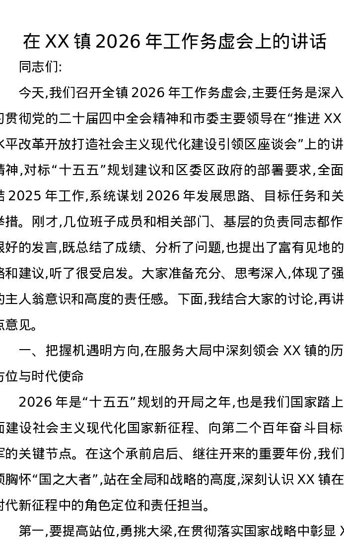 在XX镇2026年工作务虚会上的讲话2