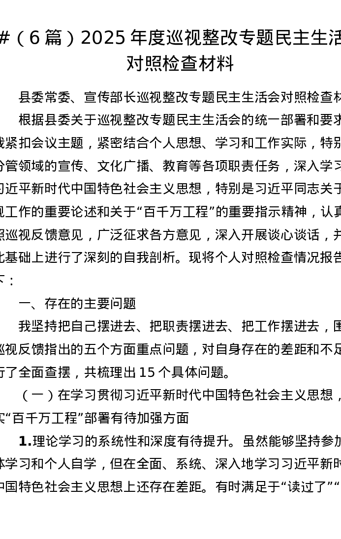 汇编:2025年度巡视整改专题xxxxx对照检查材料6篇