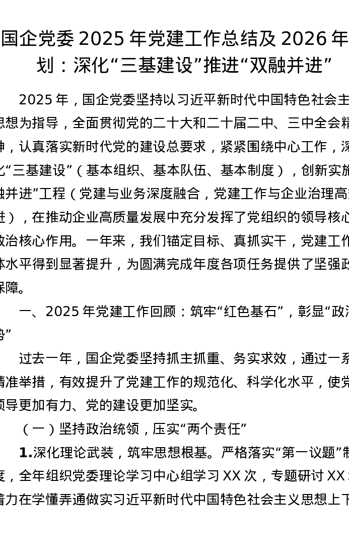 国企党委2025年党建工作总结及2026年计划:深化“三基建设” 推进“双融并进”