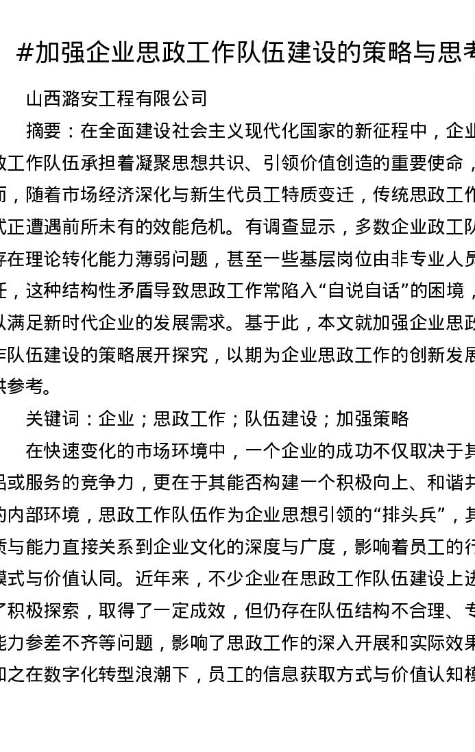 调研报告:加强企业思政工作队伍建设的策略与思考