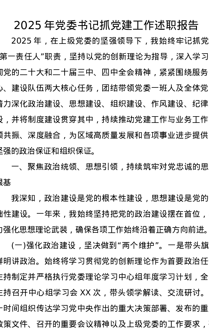 2025年党委书记抓党建工作述职报告