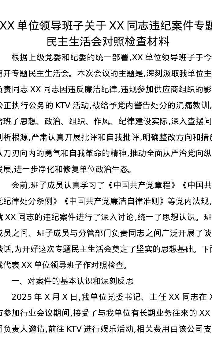 XX单位领导班子关于XX同志违纪案件专题民主生活会对照检查材料