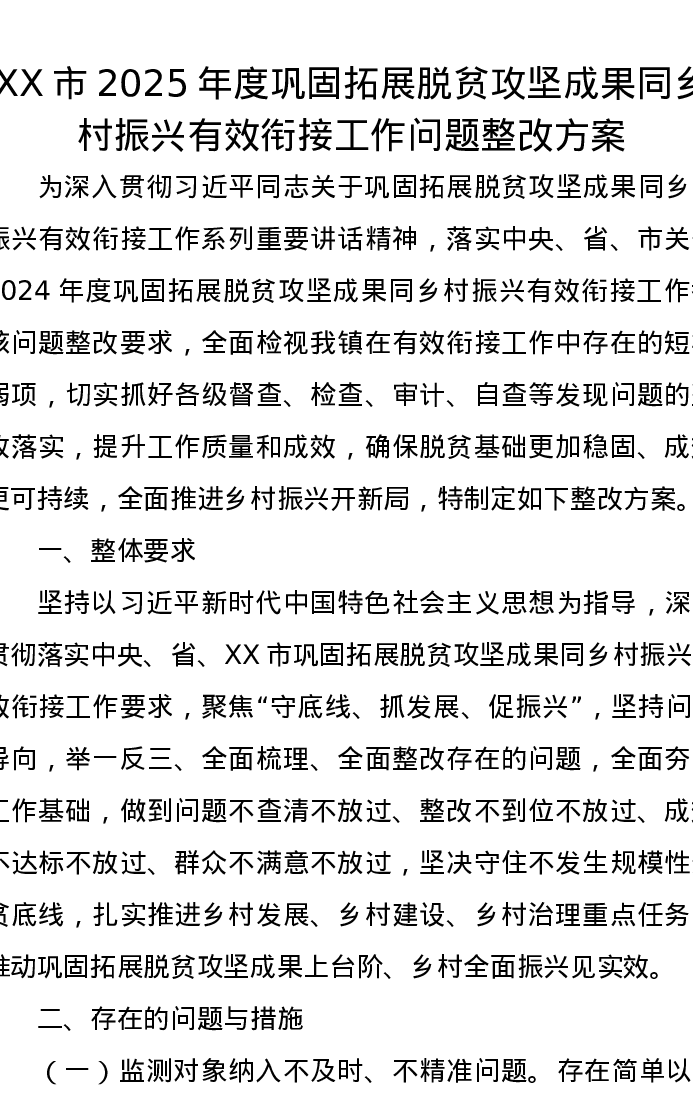 XX市2025年度巩固拓展脱贫攻坚成果同乡村振兴有效衔接工作问题整改方案