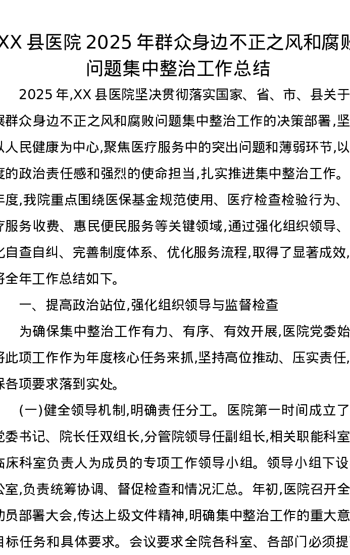 XX县医院2025年群众身边不正之风和腐败问题集中整治工作总结