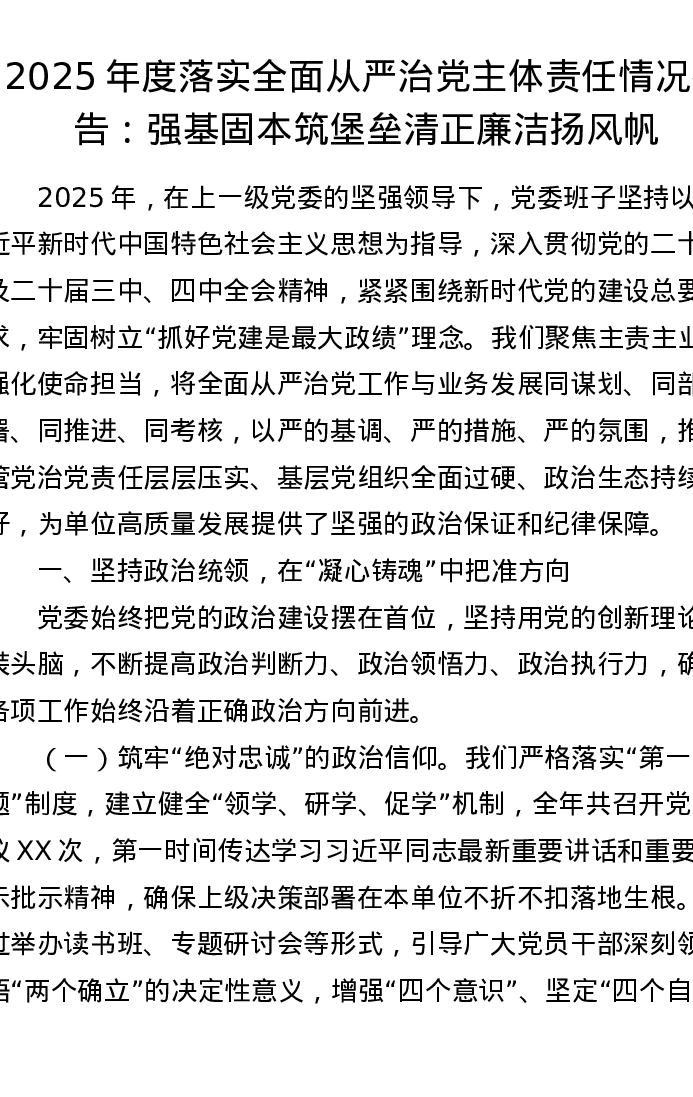 2025年度落实全面从严治党主体责任情况报告:强基固本筑堡垒 清正廉洁扬风帆
