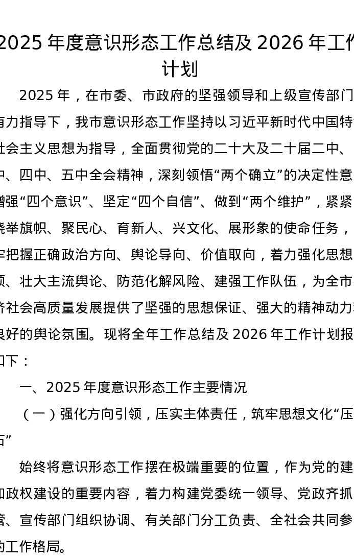 2025年度意识形态工作总结及2026年工作计划