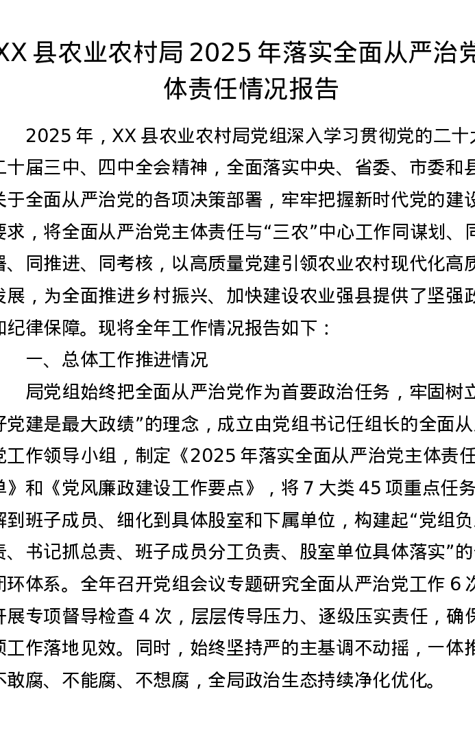 XX 县农业农村局 2025 年落实全面从严治党主体责任情况报告(含党风廉政建设、党的建设、党务公开、厉行节约反对浪费)