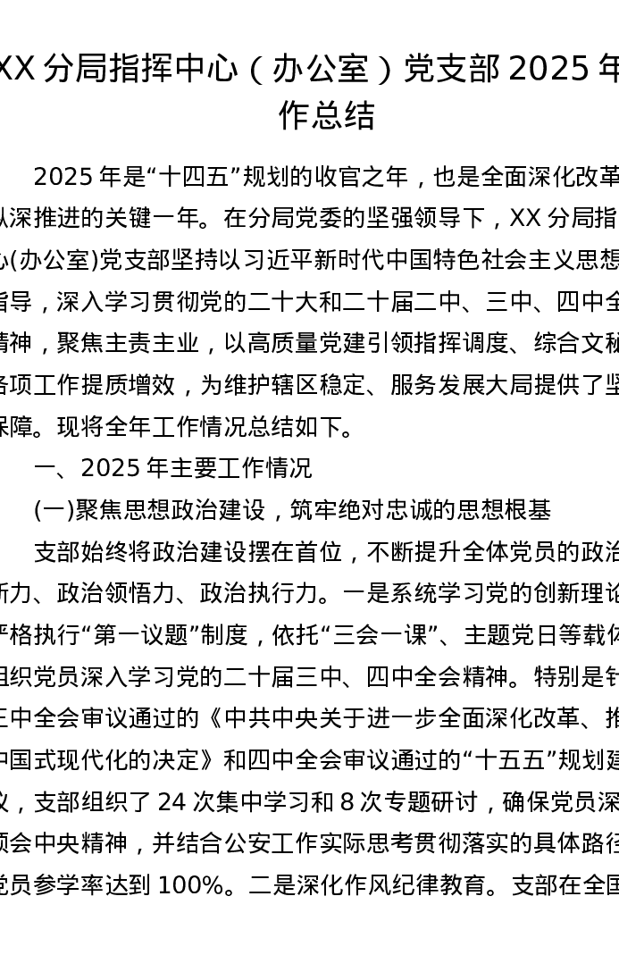 XX分局指挥中心(办公室)党支部2025年工作总结