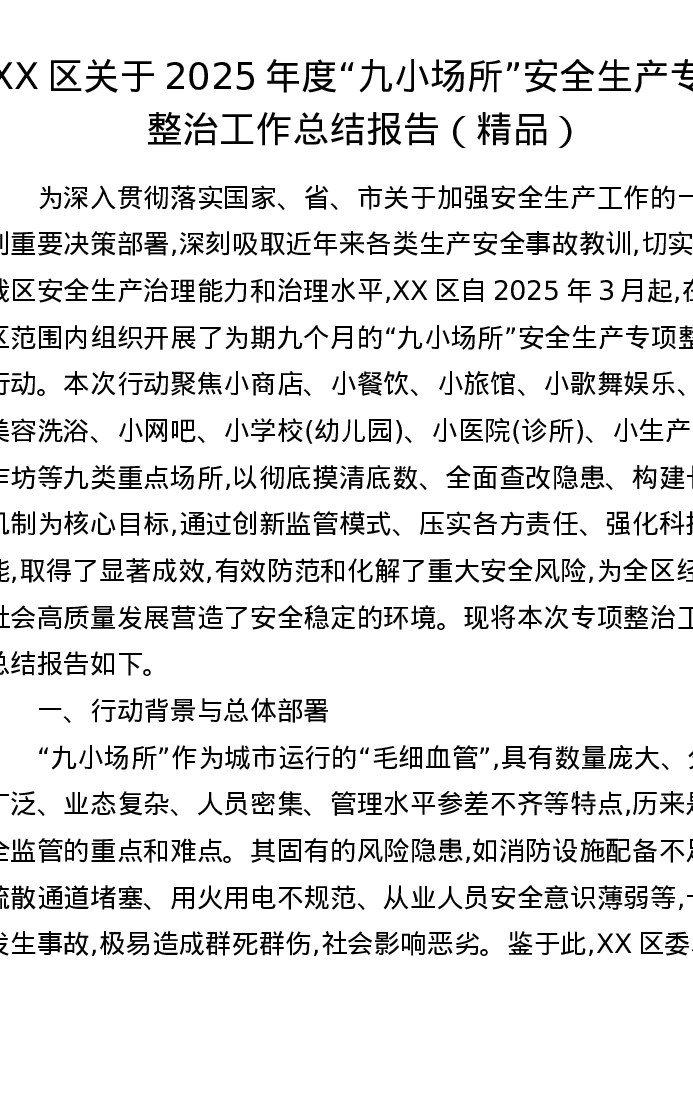 XX区关于2025年度九小场所安全生产专项整治工作总结报告