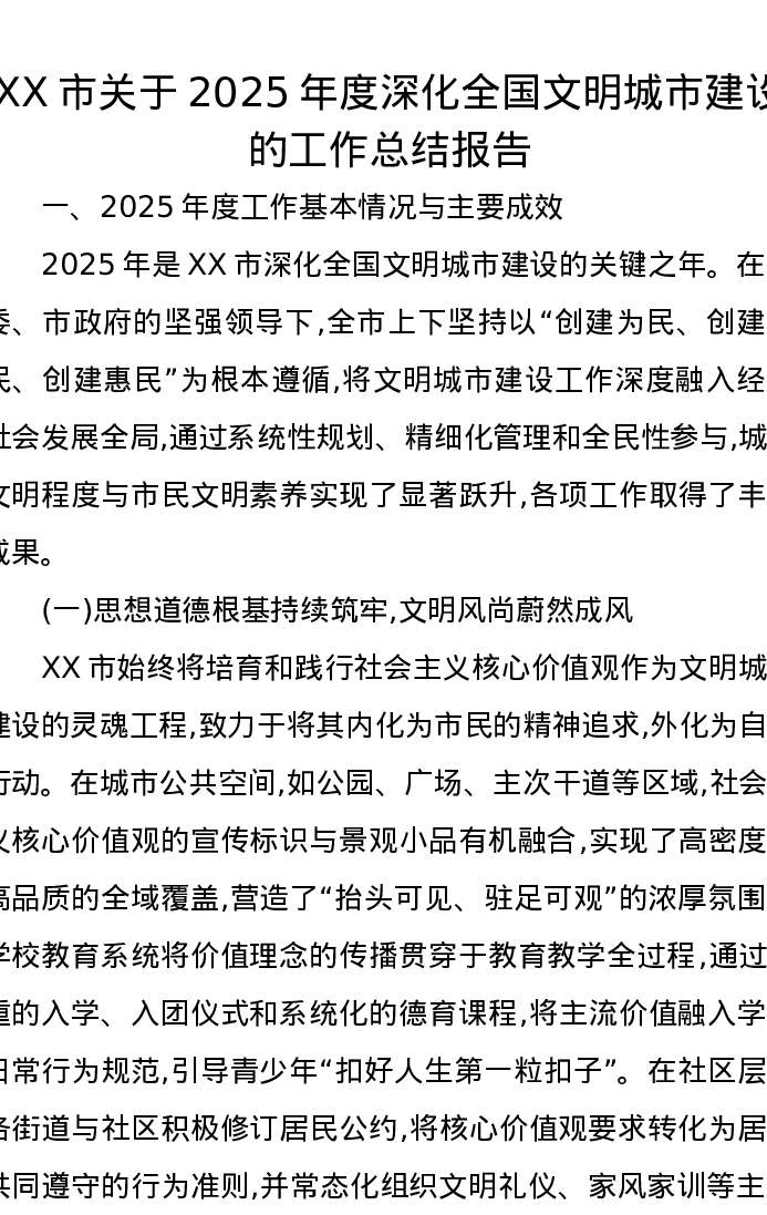 XX市关于2025年度深化全国文明城市建设的工作总结报告2