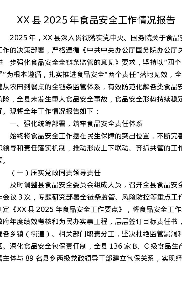 XX县2025年食品安全工作情况报告