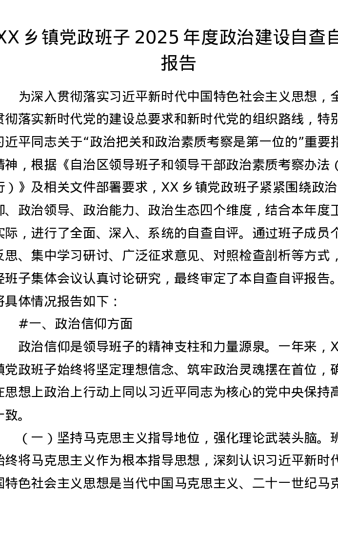 XX乡镇党政班子2025年度政治建设自查自评报告(9069字)
