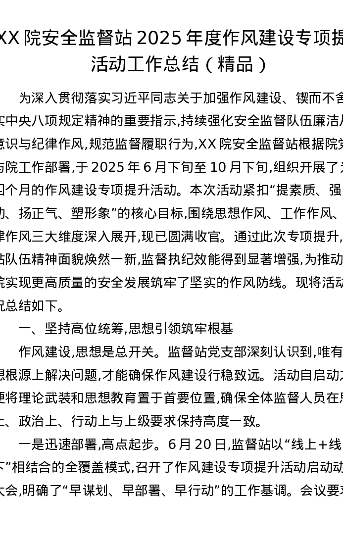 XX院安全监督站2025年度作风建设专项提升活动工作总结