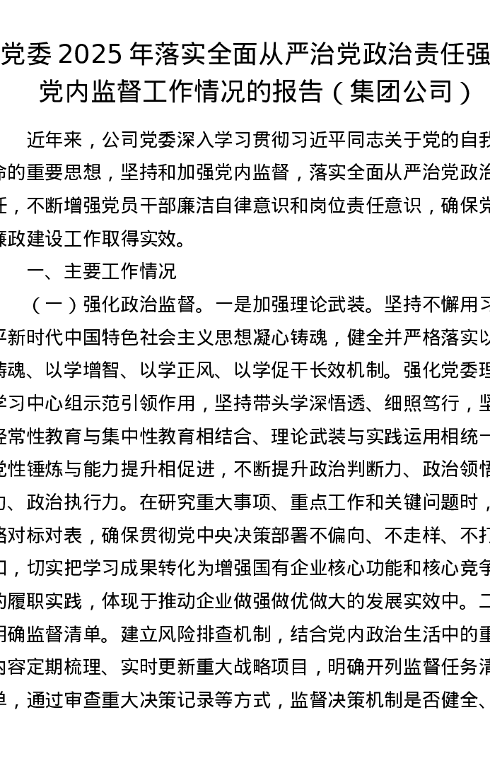 党委2025年落实全面从严治党政治责任强化党内监督工作情况的报告(集团公司)