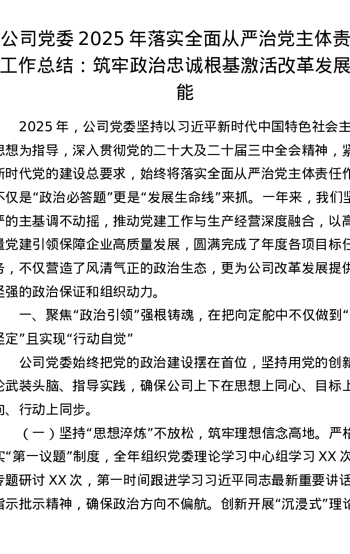公司党委2025年落实全面从严治党主体责任工作总结:筑牢政治忠诚根基 激活改革发展动能