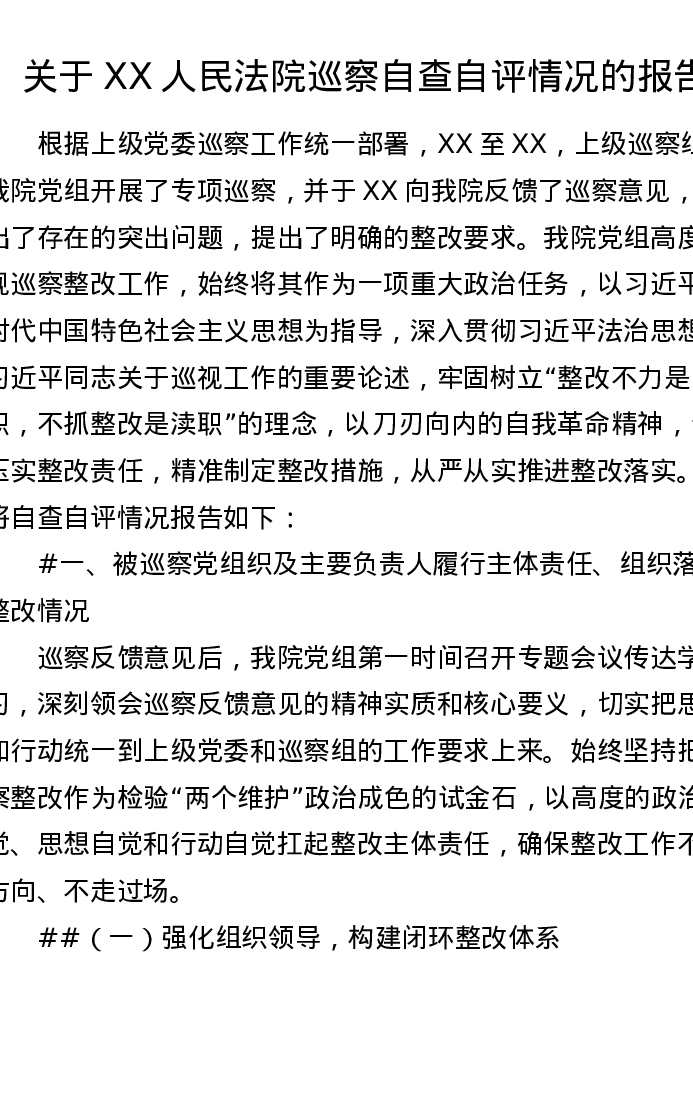 关于XX人民法院巡察自查自评情况的报告(7277字)