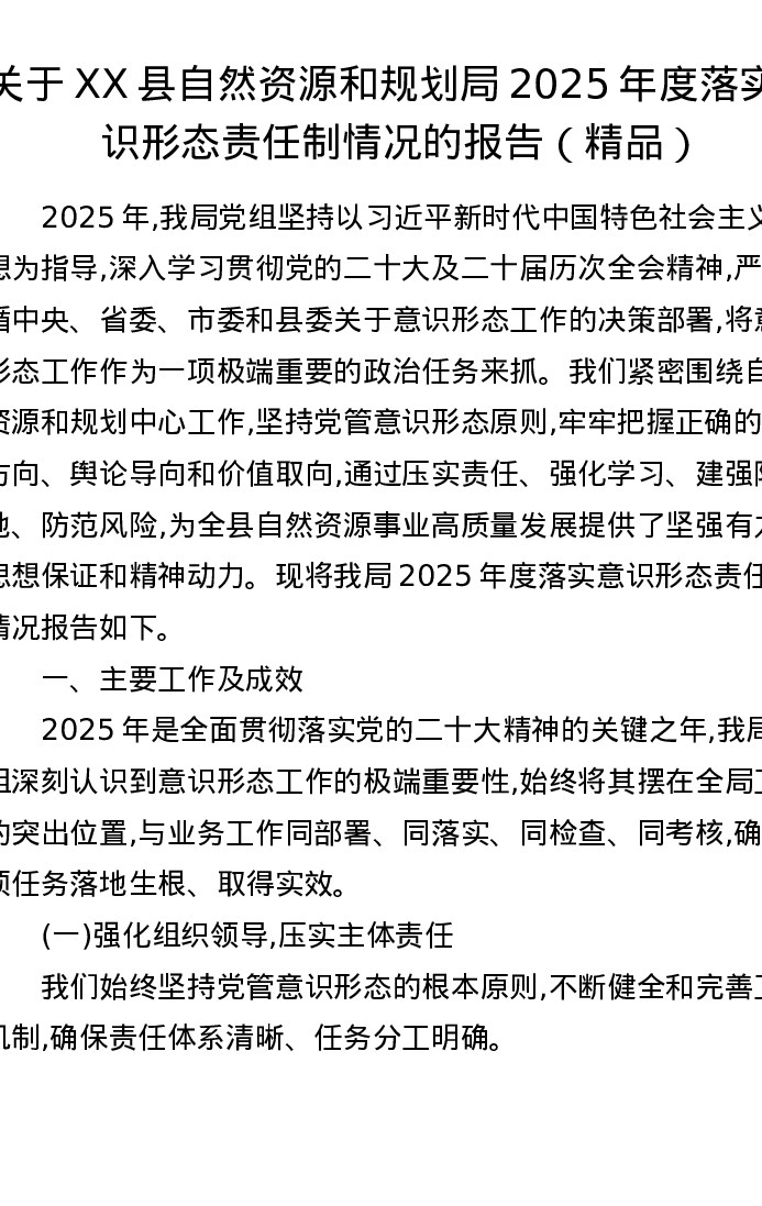 关于XX县自然资源和规划局2025年度落实意识形态责任制情况的报告