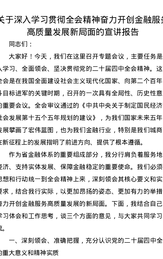 关于深入学习贯彻全会精神奋力开创金融服务高质量发展新局面的宣讲报告