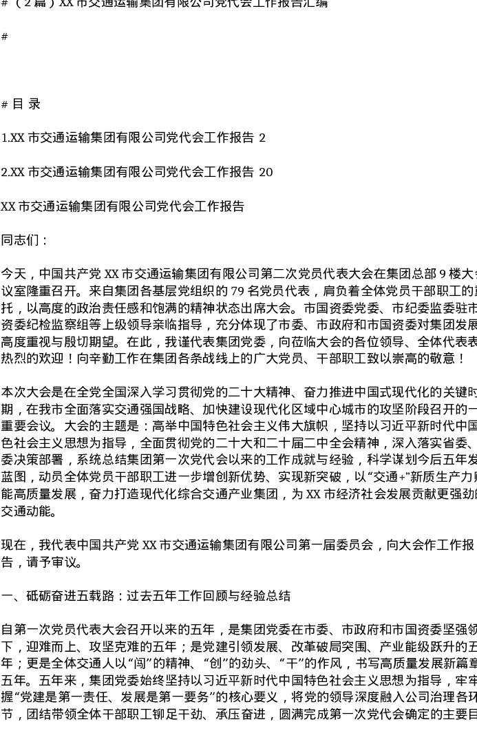 汇编:XX市交通运输集团有限公司党代会工作报告2篇