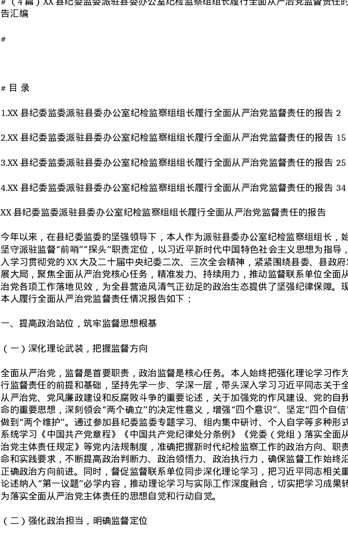 汇编:XX县纪委监委派驻县委办公室纪检监察组组长履行全面从严治党监督责任的报告4篇