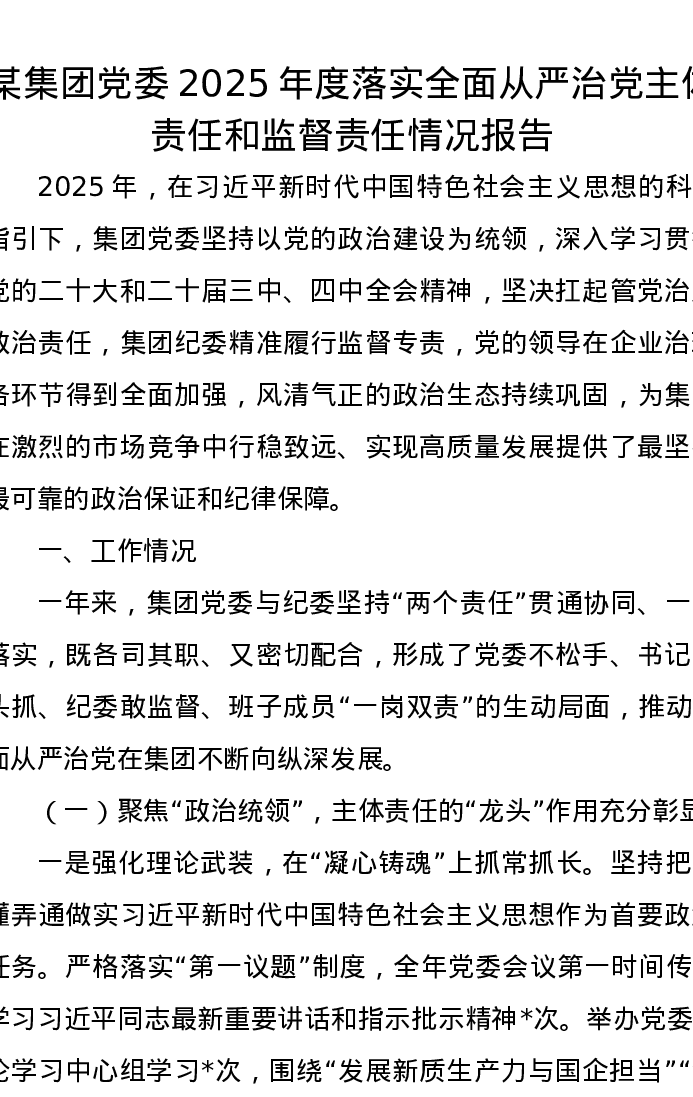 某集团党委2025年度落实全面从严治党主体责任和监督责任情况报告