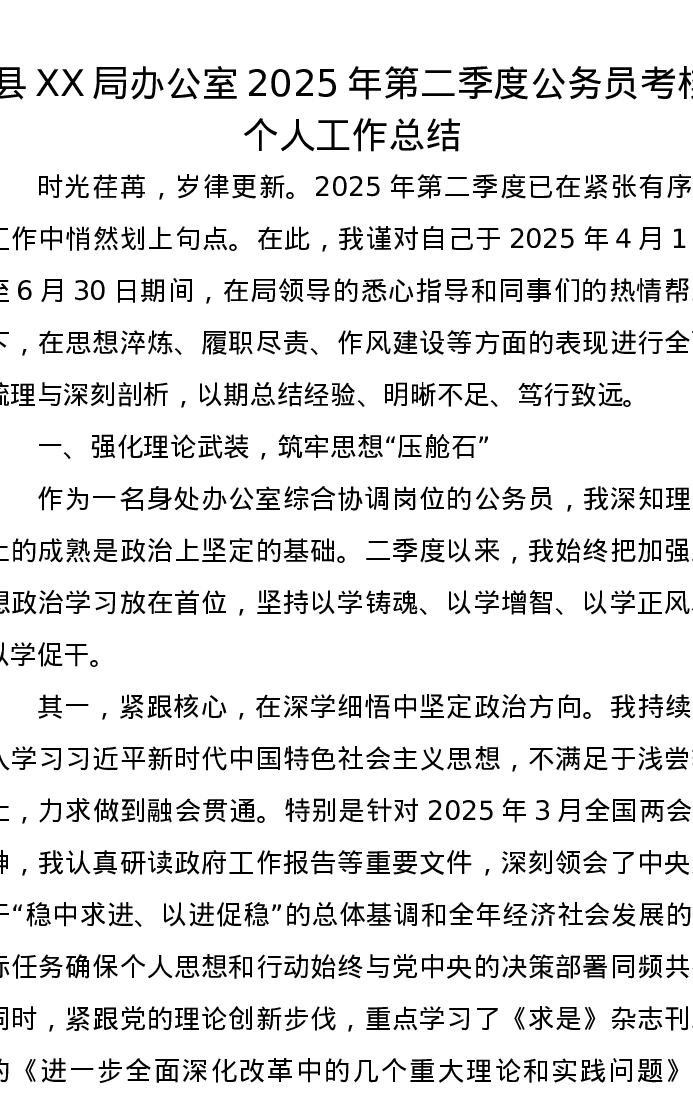 县XX局办公室2025年第二季度公务员考核个人工作总结
