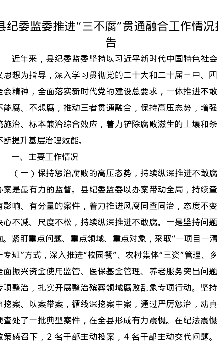 县纪委监委推进三不腐贯通融合工作情况报告