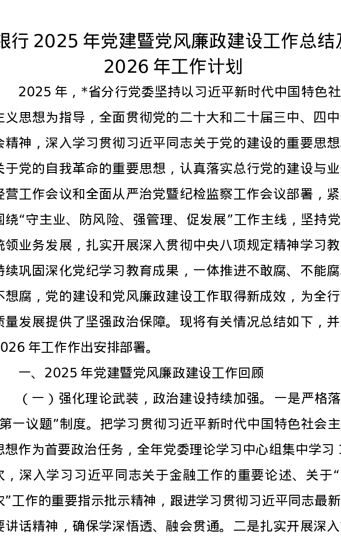 银行2025年党建暨党风廉政建设工作总结及2026年工作计划