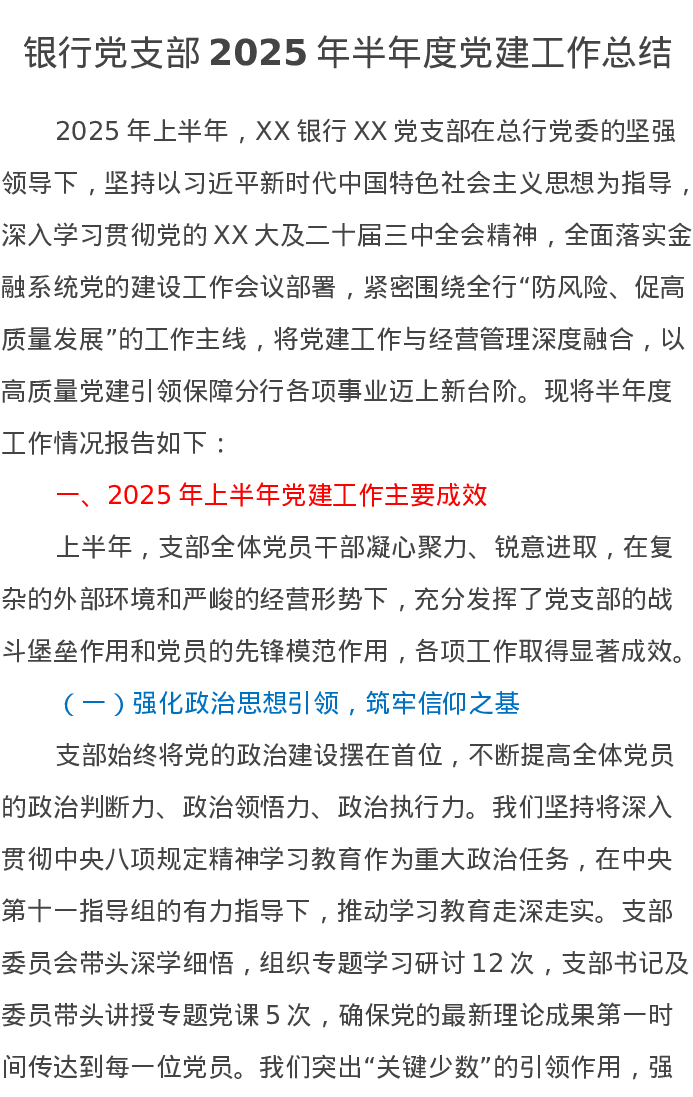 银行党支部2025年半年度党建工作总结