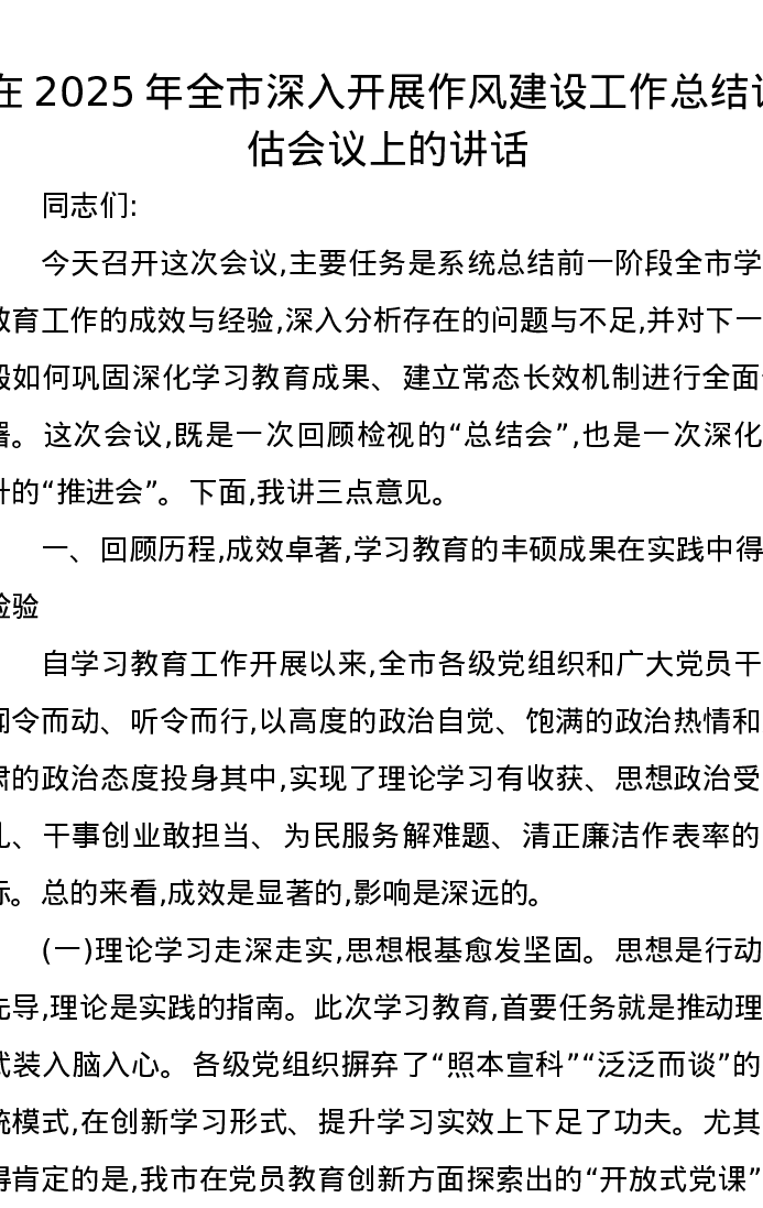 在2025年全市深入开展作风建设工作总结评估会议上的讲话
