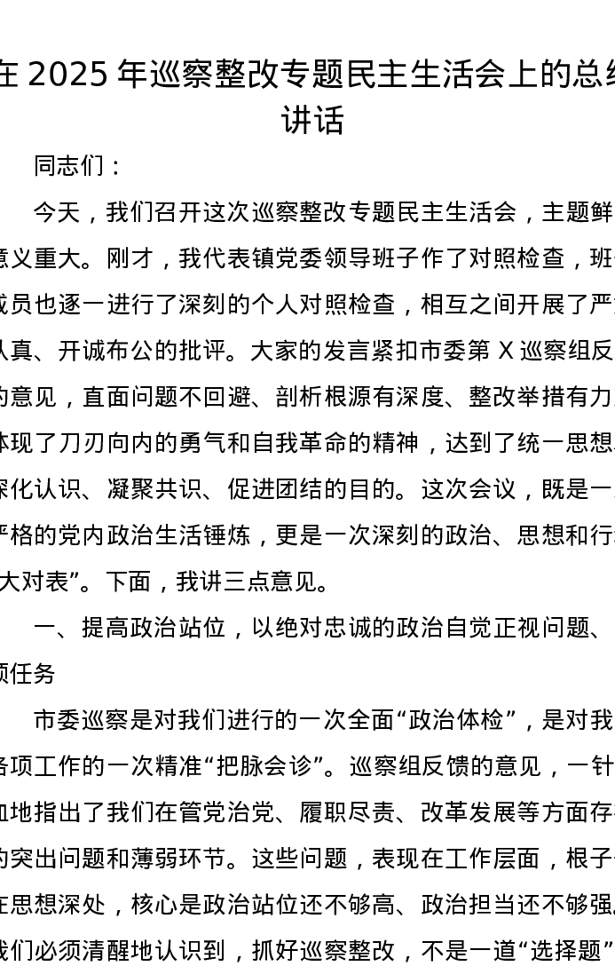 在2025年巡察整改专题xxxxx上的总结讲话