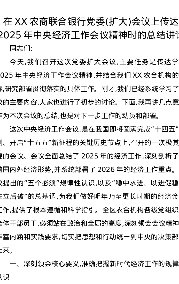 在XX农商联合银行党委(扩大)会议上传达2025年中央经济工作会议精神时的总结讲话