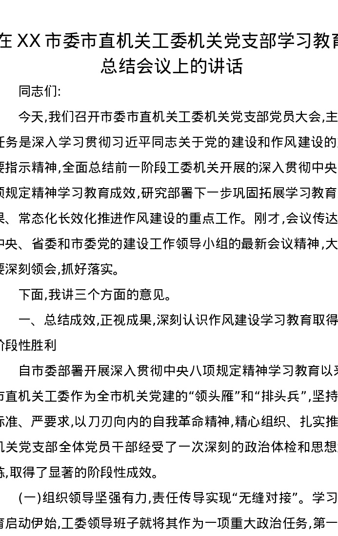 在XX市委市直机关工委机关党支部学习教育总结会议上的讲话