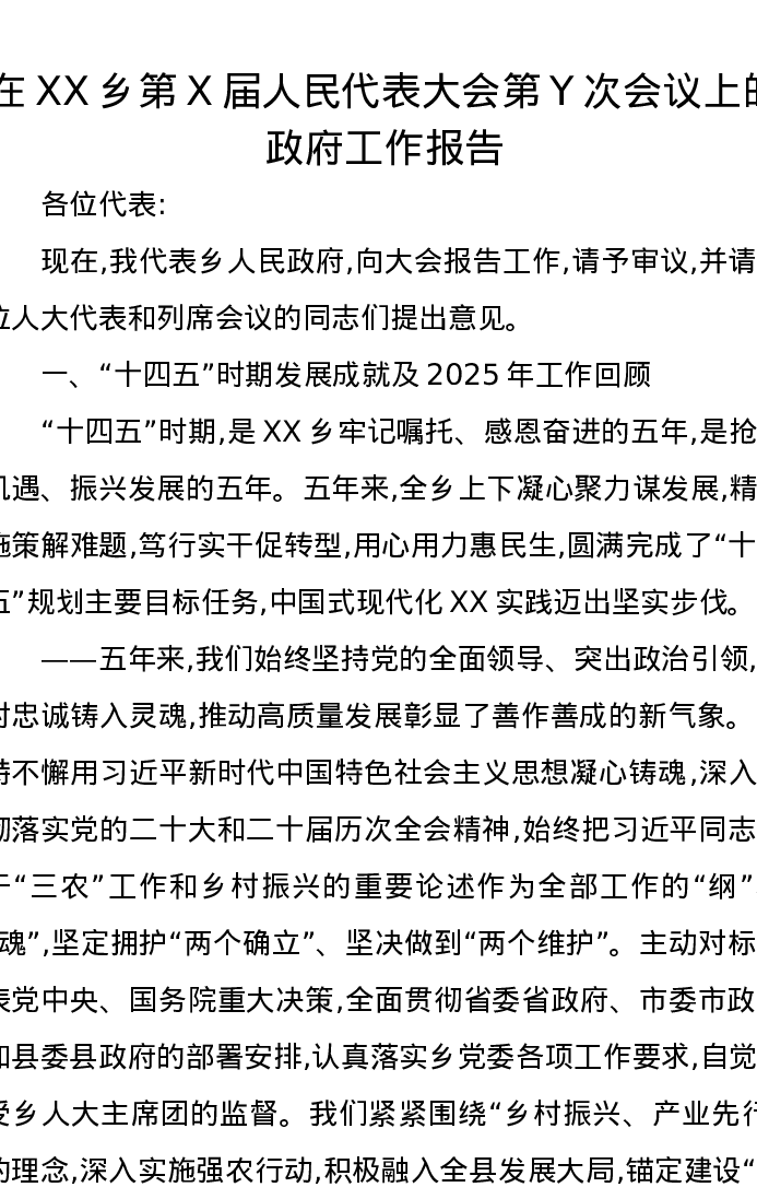 在XX乡第X届人民代表大会第Y次会议上的政府工作报告