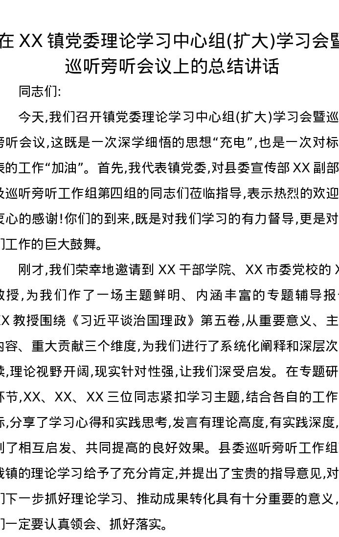 在XX镇党委理论学习中心组(扩大)学习会暨巡听旁听会议上的总结讲话