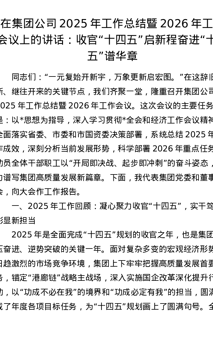 在集团公司2025年工作总结暨2026年工作会议上的讲话:收官十四五启新程 奋进十五五谱华章