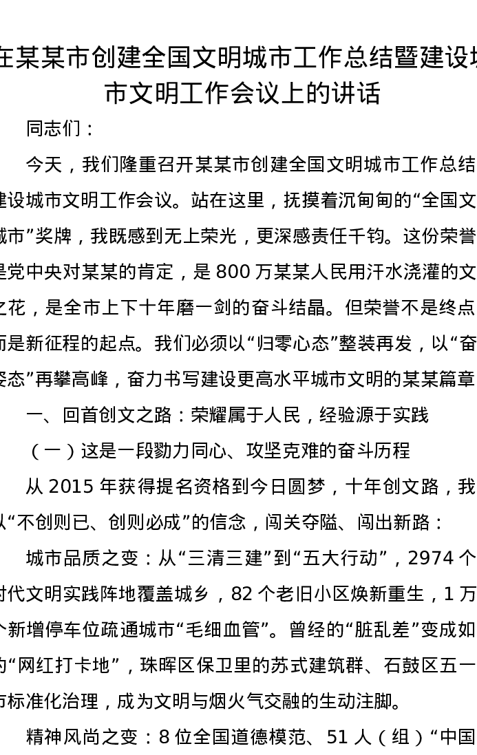 在某某市创建全国文明城市工作总结暨建设城市文明工作会议上的讲话