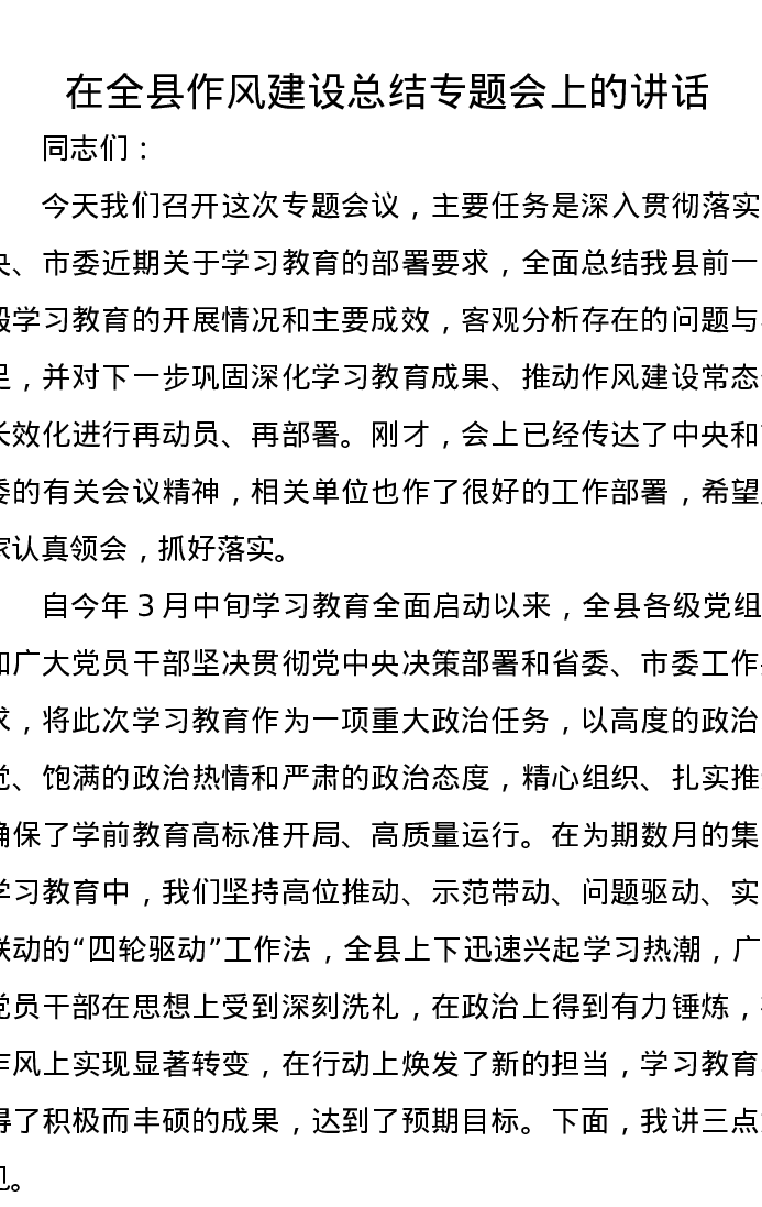 在全县作风建设总结专题会上的讲话
