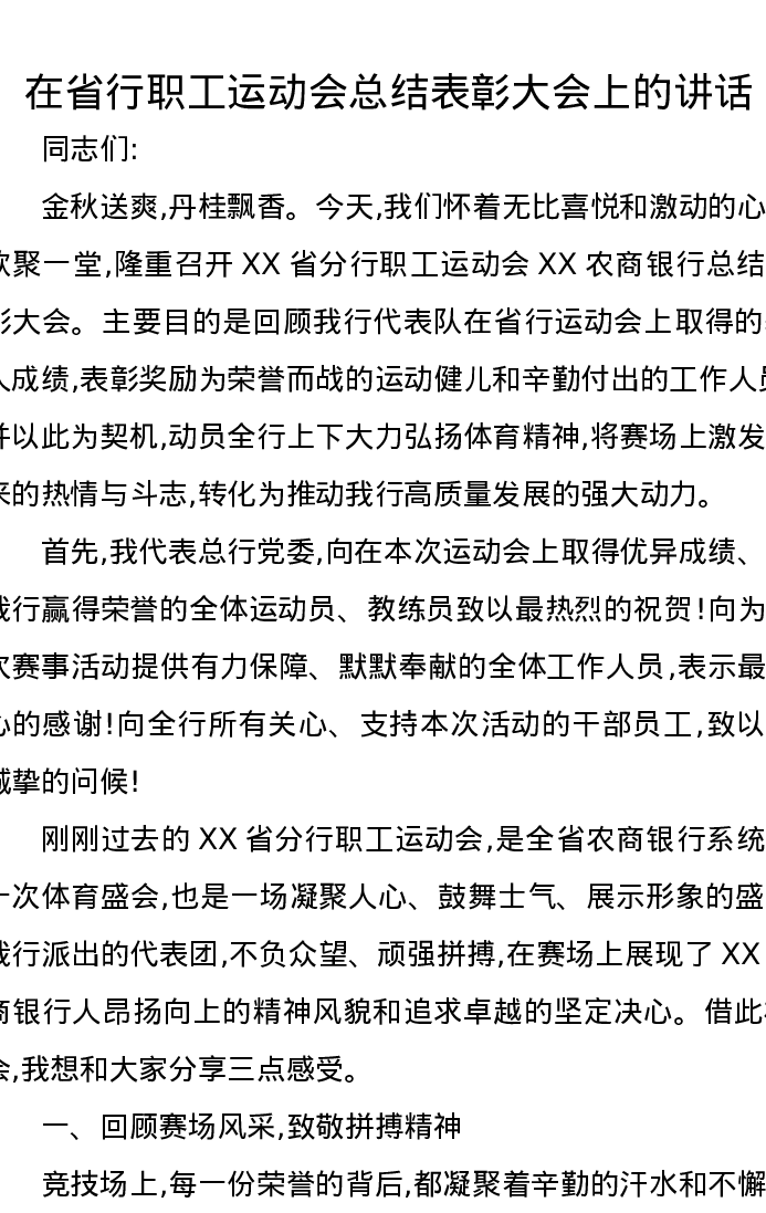 在省行职工运动会总结表彰大会上的讲话