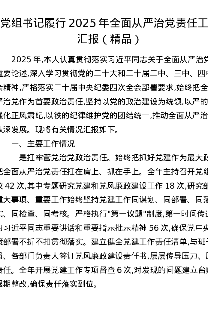 党组书记履行2025年全面从严治党责任工作汇报