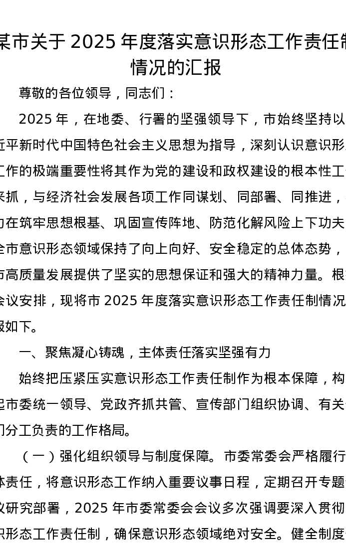 某市关于2025年度落实意识形态工作责任制情况的汇报