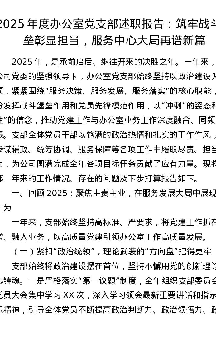 2025年度办公室党支部述职报告:筑牢战斗堡垒彰显担当,服务中心大局再谱新篇