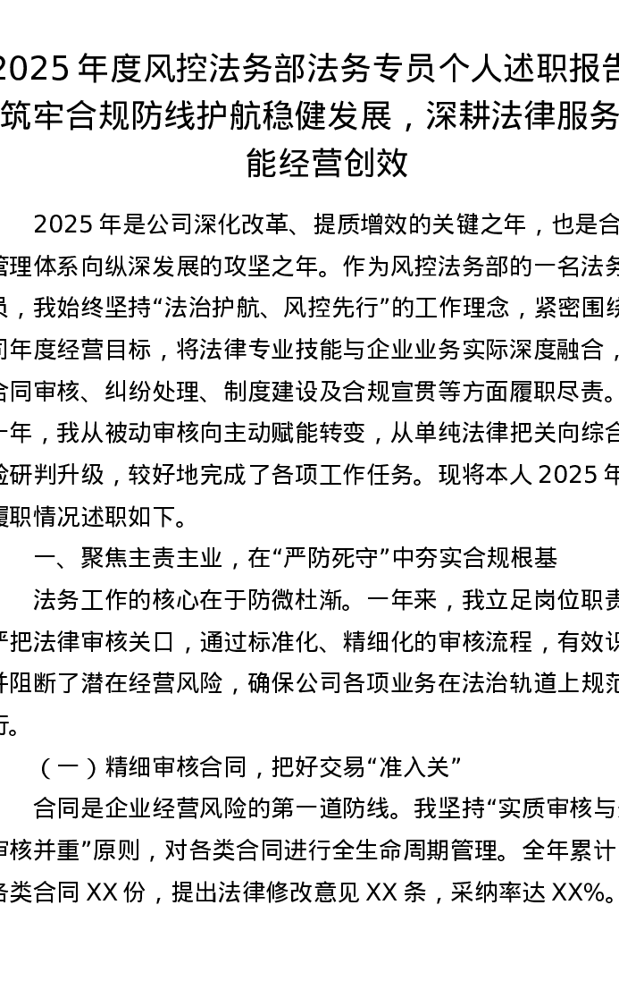 2025年度风控法务部法务专员个人述职报告:筑牢合规防线护航稳健发展,深耕法律服务赋能经营创效