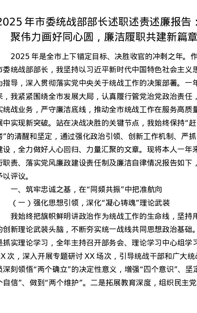 2025年市委统战部部长述职述责述廉报告:汇聚伟力画好同心圆,廉洁履职共建新篇章