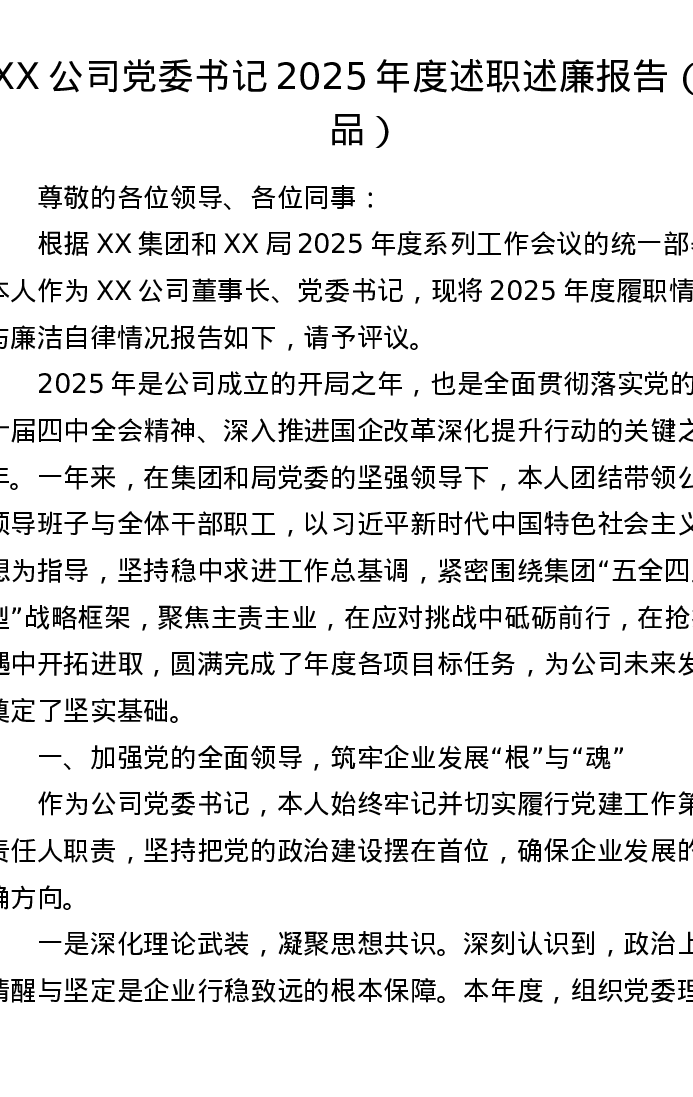 XX公司党委书记2025年度述职述廉报告