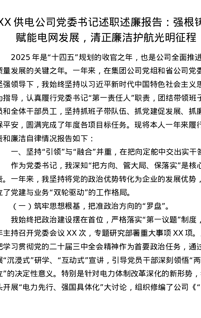 XX供电公司党委书记述职述廉报告:强根铸魂赋能电网发展,清正廉洁护航光明征程