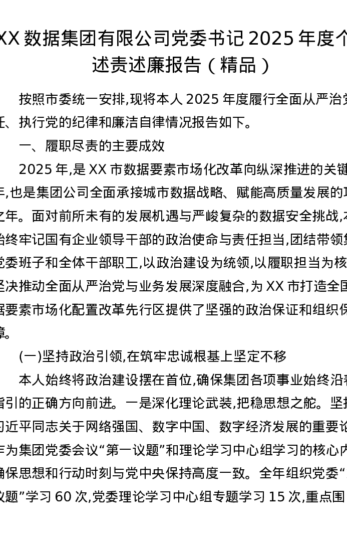 XX数据集团有限公司党委书记2025年度个人述责述廉报告