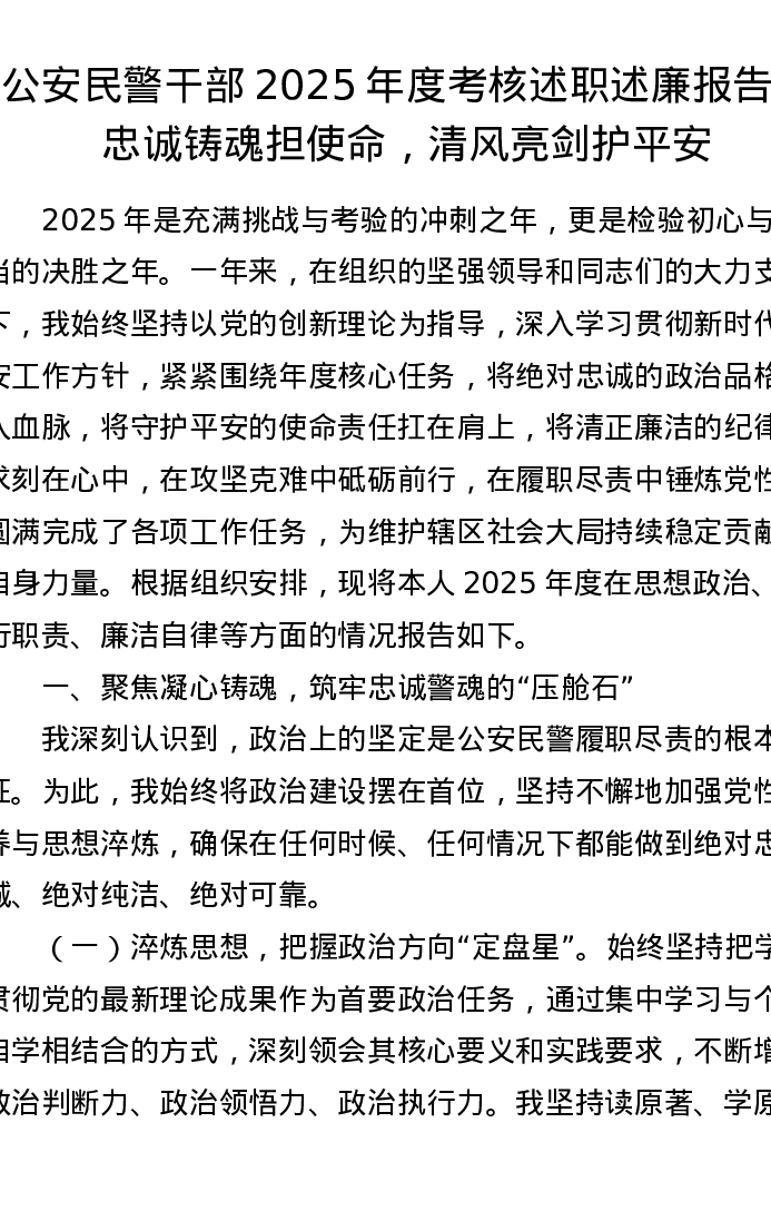 公安民警干部2025年度考核述职述廉报告:忠诚铸魂担使命,清风亮剑护平安