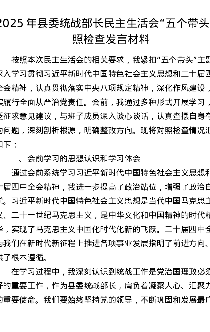 2025年县委统战部长xxxxx五个带头对照检查发言材料